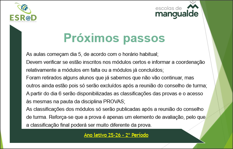 Os resultados das provas podem ser consultadas na disciplina onde foram feitas as provas ( normalmente Avaliação 3º período)